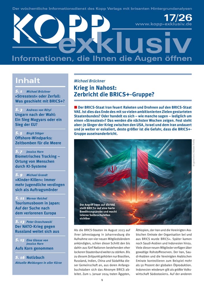 In Kopp exklusiv finden Sie Woche für Woche Hintergrundanalysen und vertrauliche Informationen aus Politik und Finanzen sowie Militär und Geheimdiensten, die Sie in den Massenmedien vergeblich suchen.